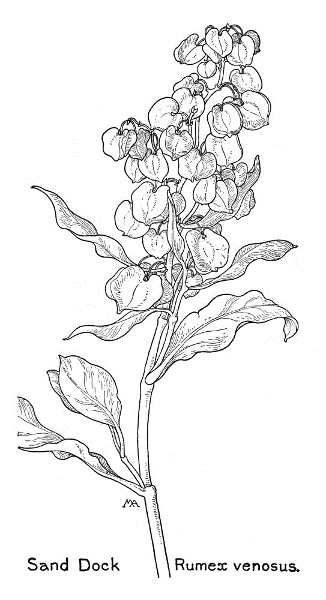 There are many kinds of Rumex, or Dock, coarse herbs, with leafy, branching, grooved stems, sheathed with conspicuous, papery stipules, strong tap-roots and acid or bitter juice. The large leaves are alternate, with smooth or wavy edges; the flowers small, greenish or reddish, on jointed pedicels, in branching clusters; the stamens six; the styles three, the stigmas shield-shaped, with a tuft of hairs at the tip. The six divisions of the flower are in two sets, the three outer small and green, the inner ones larger, colored and becoming veiny and larger in fruit, forming valves or wings, (often with a grain on the back of one or all of them,) which closely cover the three-sided fruit. These wings make the fruits of Docks more conspicuous than the flower. The Latin name comes from a word meaning "to suck," because the Romans sucked the leaves to allay thirst.