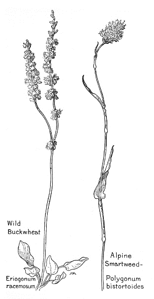 A large family, widely distributed, mostly herbs or low shrubs, with toothless leaves, often with stipules sheathing the swollen joints of the stem. The small flowers have no petals, the calyx usually resembles a corolla and has from three to six divisions. There are from four to nine stamens and a superior, mostly triangular, ovary, with two or three styles or stigmas, becoming a dry, one-seeded fruit, generally brown or black. The kind from which flour is made is cultivated from northern Asia, and the name Buckwheat, from the German, means "beech-wheat," because the grain resembles minute beech-nuts. There are several common "weeds" belonging to this family, such as Dock, Sorrel, and Smartweed.