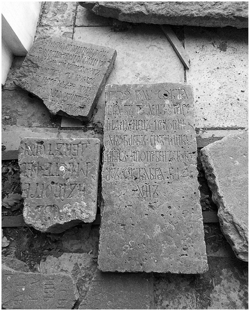 На плитах начала XVIII века мог встречаться причудливый шрифт – вязь. Плиты могли лежать на еще одной плите-основании, что позволяло ей не проваливаться в землю под своим весом. Также вместо плит мог быть поставлен и обычный деревянный крест, однако срок его жизни в петербургском климате был недолог.