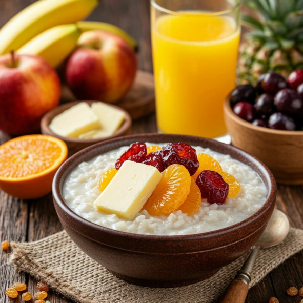 Rice porridge is served warm with a piece of butter, with a spoonful of jam, condensed milk or honey. The dish can also be served with dried fruits or fresh fruits.