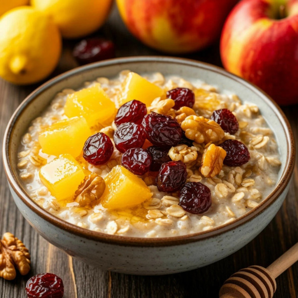 Oatmeal porridge is served warm with a piece of butter, a spoonful of jam, honey, dried fruits or candied fruits and even nuts. You can also serve this delicious dish with fresh fruits.