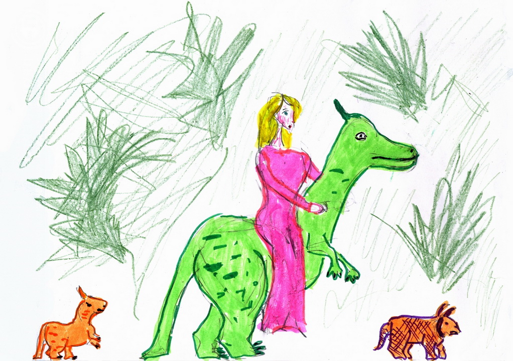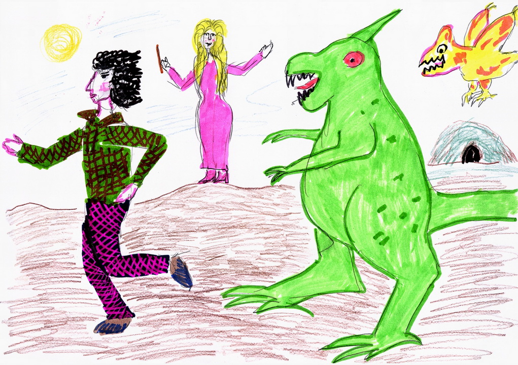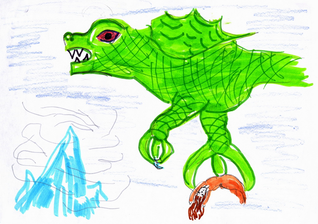 И вдруг она увидела, как незаметно для Артура, его окружают пещерные люди. Их явно привлекла яркая одежда короля, и они решили завладеть таким представительным и нарядным господином. Наде ничего не стоило тут же оглушить или разогнать дикарей каким-нибудь заклинанием, но среди них она разглядела детей и женщин, и к тому же она боялась нанести вред самому Артуру. Поэтому она притаилась за обломком скалы и стала выжидать удобного момента. И в это время с небес налетел дракон, привлеченный ярким золотистым платьем Нади. Он подхватил девушку и потащил её к себе в пещеру. Вообще-то Смог никогда не таскал к себе людей. Он пожирал или испепелял их на месте. Но Надя вся сияла, как редкая драгоценность, и дракон приобщил её к своим сокровищам. И когда Смог поднял её над землёй, Надя увидела, как пещерные люди уводят с собой Артура.