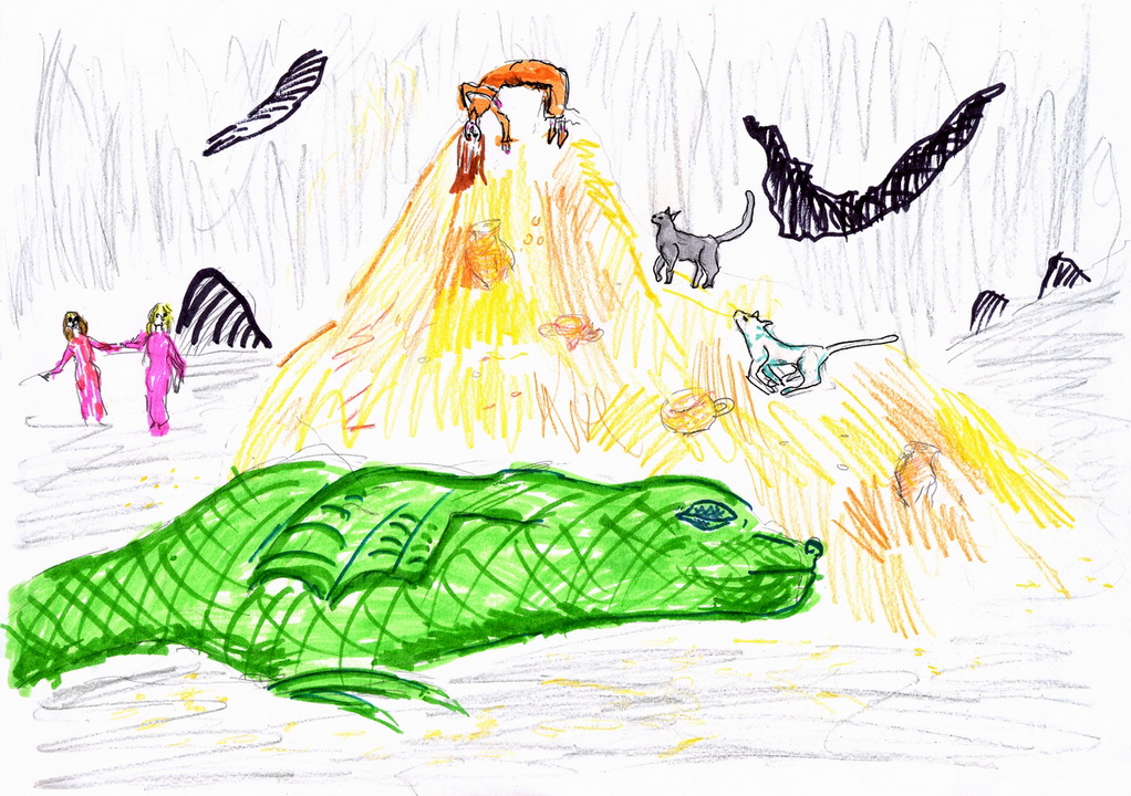 Для ночлега Альбина и Вера заклинанием Стеллы и Велины сотворили в скале просторную пещеру. Всю ночь их охраняли по очереди разные звери. А совсем рядом в пещере пировали злые и кровожадные гоблины. Им очень хотелось напасть на девушек, но когда они узнали, что в свите принцесс есть дракончики, решили не рисковать, ведь в гневе дракончики становятся грозными и страшными.