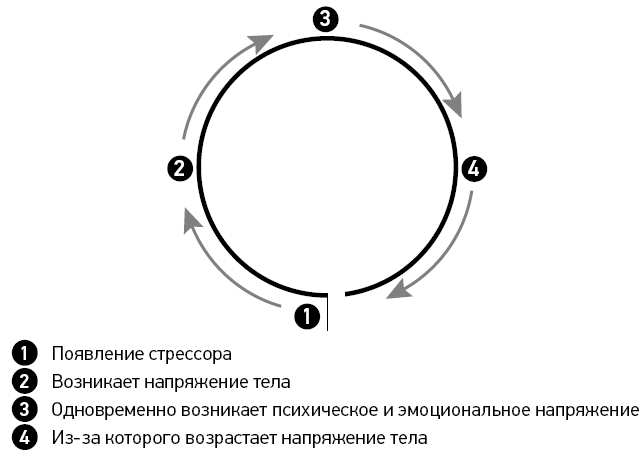 Это единство тела и сознания порой представляется чисто умозрительным. Однако оно вполне реально. Наиболее чувствительно и естественно мы ощущаем это при определенных обстоятельствах: когда получаем яркое удовольствие или когда мы чрезвычайно напряжены. Во время сильного стресса, острой боли мы испытываем физическое напряжение одновременно с умственным и эмоциональным, при этом одно усиливает другое. В этих случаях невозможно не отдавать себе отчет в том, что тело и сознание – одно целое. Эту связь можно проиллюстрировать схемой: