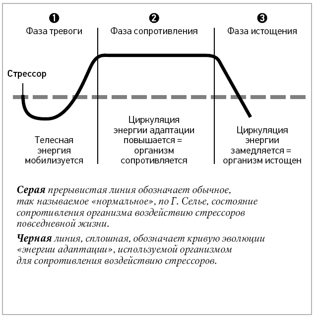 Если ситуация стресса затягивается или добавляются новые стрессоры, наши силы иссякают, и способность адаптироваться ослабевает до тех пор, пока мы не опустимся ниже начального порога, в фазу истощения – очень опасное состояние, угрожающее нашему здоровью. Очевидно, что именно в этот период, особенно если ситуация затягивается, наиболее высок риск психосоматических расстройств.
