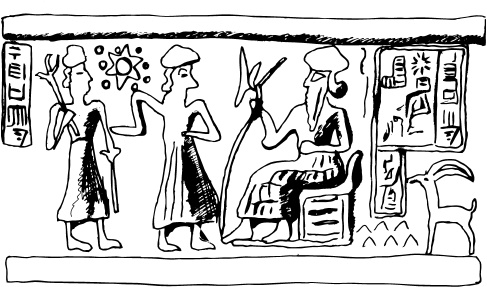 Ayakta duran iki karakterin arasında Güneş’e benzeyen, on bir gök cismiyle çevrili bir şekil görülür; oturan karakterden biraz ötede ise on ikinci bir cisim bulunur. Zecharia Sitchin 1970’lerde bu mührün önemine dair bir kitap yayımlamış, on bir noktanın Güneş Sistemi’mizin dokuz gezegenine ve iki Ay’ına benzediğini ileri sürmüştür; bu da Sümerlerin astroloji bilgisinin ve Güneş Sistemi’ne dair herkesten binlerce yıl önce gelen kavrayışlarının olağanüstü bir örneğidir.