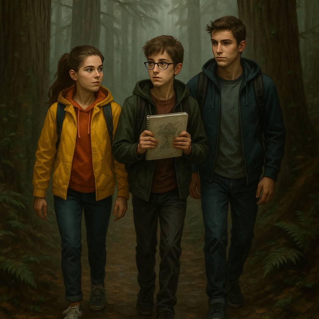 Выйдя из автобуса, дети тут же почувствовали резкий холодный ветер. Он пробирался под куртки и капюшоны, заставляя поёжиться. Казалось, что лес вокруг застыл, наблюдая за ними тысячами невидимых глаз.