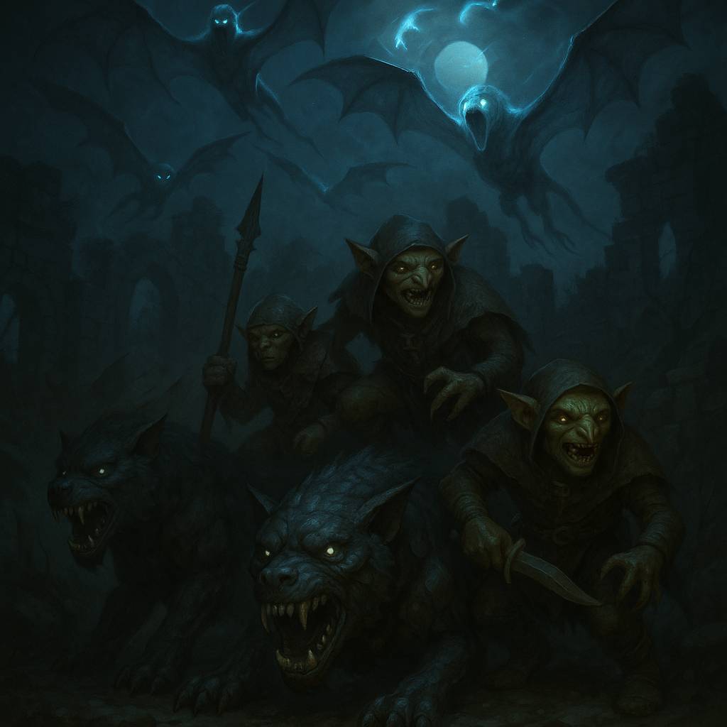 Гоблины – жестокие и коварные создания. Их города никогда не знают тишины: грохот кузниц, где куют ржавые, но смертоносные клинки; крики пленников; злобные песни воинов. На стенах – рисунки, изображающие сцены пыток, побед и предательств. Гоблины почитают хаос и верят, что в разрушении скрыта истинная сила.