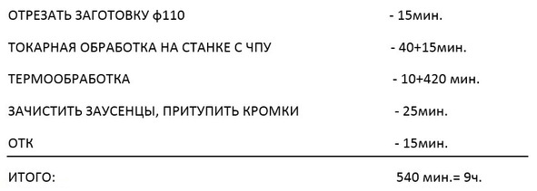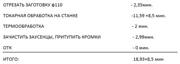 Откуда взялись «+15», если не всем понятно. У любой работы есть подготовительно-заключительное время (ПЗВ). Об этом мы ещё будем говорить. Это время на раскладку инструмента, получение задания, изучение чертежа, включения-выключения станка и т.п.. Это те работы, которые делаются один раз для того, чтобы потом сделать партию деталей. Чтобы учесть ПЗВ в трудоёмкости одного изделия, надо время, затраченное на неё, разделить на количество деталей в партии. Здесь подготовительно-заключительное время вполне реально, но только в итоге, как мы видим, оно просто прибавляется к трудоёмкости каждой детали.