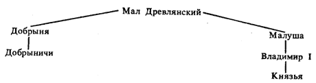 Но между выводом о тождестве Малко Любечанина с Малом Древлянским и родословным древом «Малковичей» в статье содержался еще разбор судьбы потомков – одного Добрыни. Прозоровский, в частности, проследил некоторые парадоксы их положения. Он подметил, что, судя по летописям и некоторым другим документам XI века, Добрыничи, не будучи князьями, нередко (даже еще во второй половине XI века) занимали положение, равное княжескому. Он истолковал это как результат династического брака Малуши со Святославом, того, что Мал «приходился сватом Ольге (здесь первоначальное близочество между родами Рюрика и Малка)»[24].