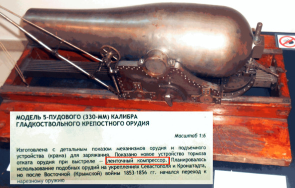 Макет крепостного орудия, на табличке которого написано, что орудие имеет «ленточный компрессор».