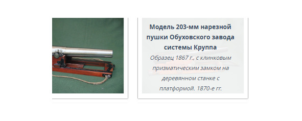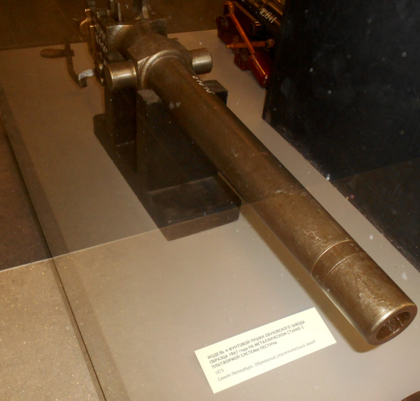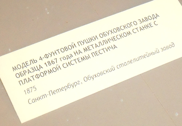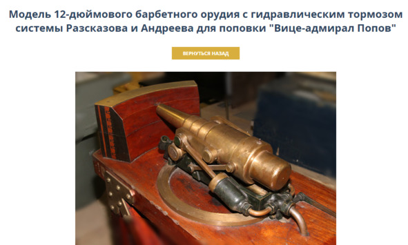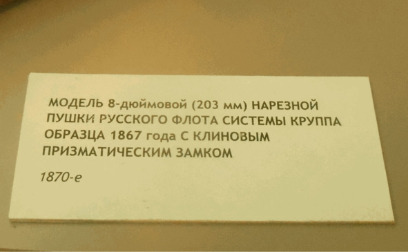 «По поводу орудий системы Рассказова. Одну неточность по этому поводу вы с моей подачи убрали, но другую по аналогии не захотели. Рассказов не делал этих орудий. На макетах находятся стволы 12-дюймовых орудий обр. 1867 года системы Круппа с длиной ствола 20 калибров. Их изготовили в количестве 6 штук. 4 орудия были установлены на броненосце „Петр Великий“ и две пушки – в барбетной установке круглого броненосца „Вице-адмирал Попов“. Первоначально орудия на „поповке“ стояли на временных станках с постоянной высотой оси цапф и струнным компрессором (трения). Однако осенью 1878 года были установлены снижающиеся гидравлические станки системы Рассказова, изготовленные в Англии. В другом зале стоит макет „Орудие с гидравлическим откатником“, если я не ошибся в названии. Так это тоже снижающийся станок. Орудиями на таких станках предполагали вооружить береговую артиллерию, но потом отказались».