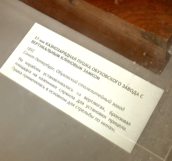 Видимо, работники музея не ознакомились с ее содержимым. Для справки – это орудие имело просто ПРИЗМАТИЧЕСКИЙ ЗАТВОР. Лучше бы не меняли старую табличку».