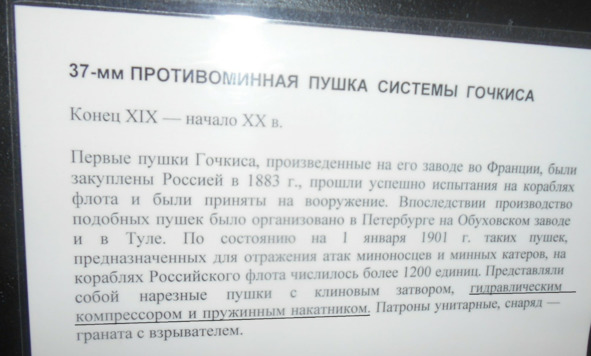 Выслано письмо работникам музея с разъяснением, что это орудие системы Гочкиса, изготовлено на Обуховском заводе. Что Обуховский завод не занимался разработкой систем этого калибра, и орудие предназначалась для стрельбы по миноносцам, носителям минного оружия, а не по минам (интересно каким, с точки зрения работников музея, якорным или минам Уайтхеда?). Причем раньше в экспозиции ЦВММ была табличка к аналогичному 37-мм орудию с правильным текстом.