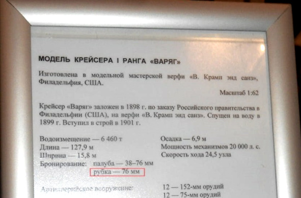 Долго не мог понять, почему толщина брони боевой рубки не исправлена, пока не открыл справочник* Моисеева «Справочник кораблей русского парового и броненосного флота», где указана эта толщина. Работники музея не знают, что на крейсерах 1-го ранга минимальная толщина брони была примерно равна калибру главной артиллерии, т.е. 140—150 мм. И если ознакомиться с материалами постройки крейсера «Богатырь» (ровесник «Варяга») в Германии, на котором для уменьшения перегрузки при постройке была уменьшена на 10 мм толщина брони рубки, то можно прочитать о неудовольствии членов МТК, рассматривающих этот вопрос.