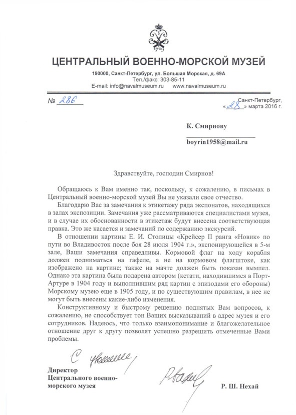 «Здравствуйте, Руслан! Посетил ЦВММ и увидел очередную неточность. У Вас висит картина «Крейсер «Новик» на пути во Владивосток» (как-то так называется). На картине изображен корабль, несущий на ходу флаг на флагштоке (палка, железная или деревянная, на корме (задней части) корабля). По уставу ВМФ флаг на ходу корабль несет на гафеле (железная или деревянная палка, прикрепленная к мачте и имеющая две степени свободы). Также на мачте отсутствует вымпел (узкое длинное полотнище с косицами на конце), который поднимается на последней мачте до самого клотика с началом кампании и спускается только в конце ее. Так, для справки: на стоянке корабли 1-го и 2-го ранга несут флаг на флагштоке и гюйс (так называемый крепостной флаг) на гюйсштоке (железная или деревянная палка, расположенная в носовой (передней) части корабля). Может быть. эту «картину» писал какой-то знаменитый «художник», но он очень далек от флота. Сделайте, пожалуйста, соответствующие выводы.
