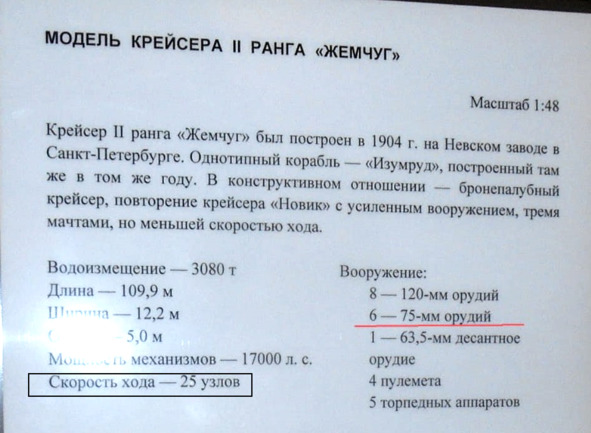На табличке к модели крейсера «Жемчуг» неправильно указан калибр артиллерии и скорость хода.