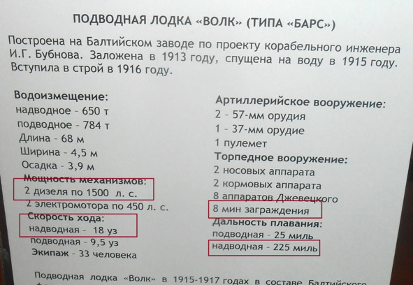 – Мощность двигателя (указана проектная). Лодка имела 2 дизеля мощностью 250 л.с.