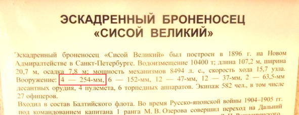 Неправильно указан калибр орудий броненосца «Сисой Великий». Орудия главного калибра броненосца – 305 мм, а не 254 мм.