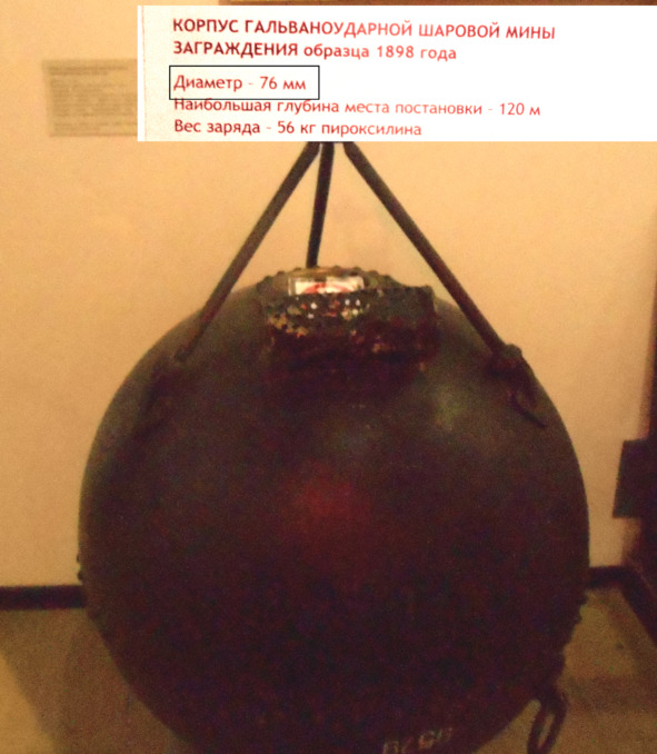 То, что корпус гальвано-ударной мины заграждения образца 1898 года установлен вверх ногами – это половина беды. Диаметр корпуса ее 76 миллиметров. Спросил сотрудника: «Не очень маленький?» Но сотрудник ответил: «Это внутренний диаметр мины».