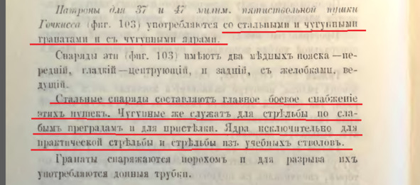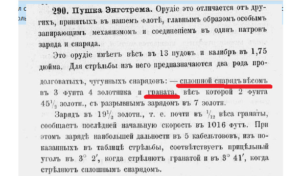 В книге *«Учебник по артиллерии для учеников класса комендоров учебно-артиллерийского отряда Балтийского флота. Издание 1904 года» С-Петербург 1904 год, написано, чем на самом деле стреляли эти орудия:
