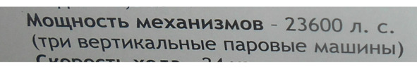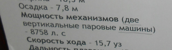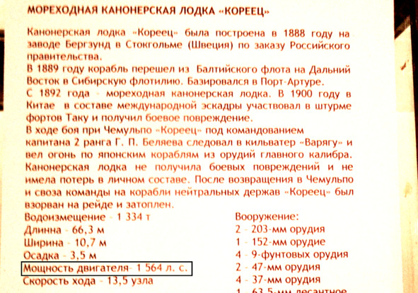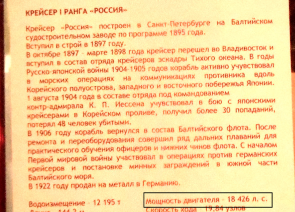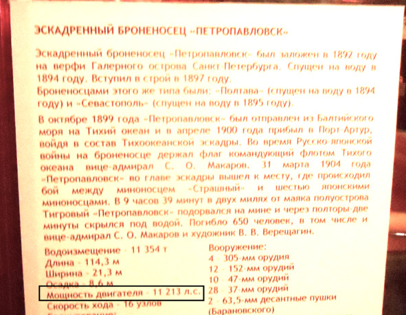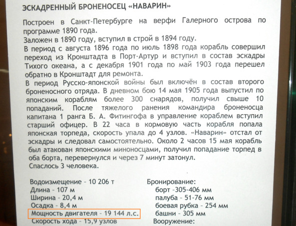 Мощность механизмов, а не двигателя броненосца «Наварин» (у броненосца было две паровые машины), была 9144 л.с. а не 19 144 л. с. У кораблей нет такого понятия как мощность двигателя. Двигатели устанавливаются на машины, танки и прочую колесно-гусеничную технику. У кораблей есть механизмы, машины. Но работники музея пишут на табличках «двигатель», даже не учитывая количество установленных машин. Так, у канонерской лодки «Кореец» две паровые машины, на табличке один двигатель.