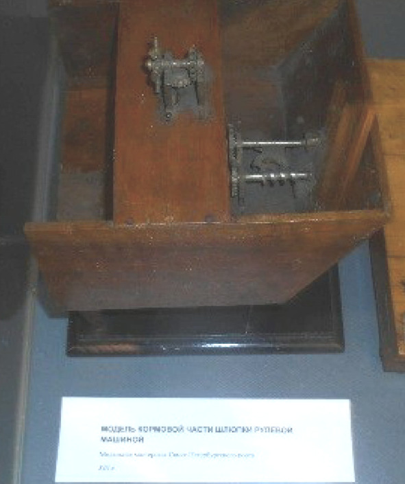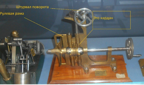 «В этом же зале находится макет шлюпочной рулевой машины – ЭТО НОНСЕНС. Управление рулем шлюпки производится румпелем (см. документ), а не рулевой машиной, тем более с многоступенчатой передачей. Следовало бы сперва посмотреть, что на макете полноценная корма судна, а не шлюпки».