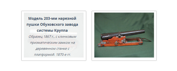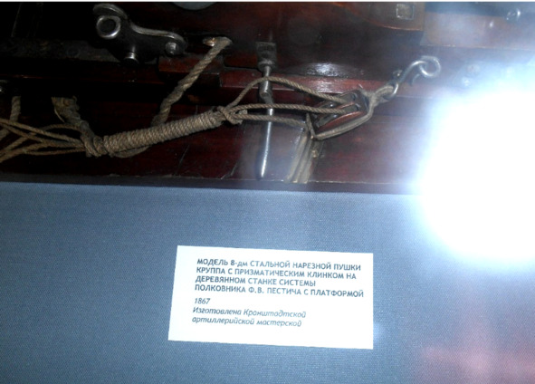«В зале периода 1860—1900 гг. находится макет 8-дюймовой гладкоствольной пушки системы Пестича. Маленький нюанс. Пестич никакого отношения не имеет к этому орудию, да и само оно было не гладкоствольным, а нарезным, не скрепленным образца 1867 года (крупповским). Кстати, рядом находятся два совершенно одинаковых с этим экспонатом орудия системы Круппа образца 1867 года. Попробуйте найти визуально их различия, думаю, это вам не удастся. Пестич проектировал только станок к этому орудию. Приложение *«Исторический очерк развития наибольшего берегового калибра в России (1838—1888 г.г.)» Санкт-Петербург 1889 год. Там вы найдете чертеж гладкоствольного 8-дюймого орудия. В „Памятной книге для морских артиллеристов“ есть этот станок».