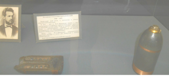 «2) В витрине, посвященной деятельности Барановского, находится разрез „гранаты“, как у вас написано. Но это шрапнель. Да и название рядом лежащего с ним экспоната „снаряд“ тоже неверно. В артиллерии того времени все, что весило менее одного пуда, называлось граната, а более – бомба. Так что это граната, а не снаряд. Приложение: *Третьяков Г. М. „Боеприпасы артиллерии.“ Военное издательство Вооруженных сил союза ССР Москва 1947 год. Подобная ошибка у вас в описании 4-фунтового орудия яхты „Держава“, где указана в применяемых боеприпасах разрывная картечь. Такого боеприпаса в нарезной артиллерии никогда не было. См. также в этой книге».