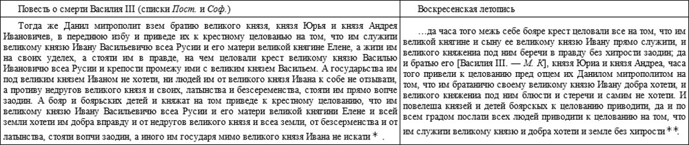 Поскольку первоначальная редакция Повести о смерти Василия III была составлена, вероятно, в то время, когда на митрополичьем престоле был Даниил (т.е. до 1539 г.), то неудивительно, что именно он оказывается в центре описываемых событий: митрополит, «взем» братьев великого князя в переднюю избу, «приведе» их к крестному целованию на верность Ивану IV и его матери; и он же «приведе» к крестному целованию бояр, детей боярских и княжат. Совершенно иная тенденция характерна для Воскресенской летописи, составленной в 40-е годы, в разгар «боярского правления». Здесь роль Даниила сведена к минимуму: оказывается, бояре сами «межь себе» крест целовали, что будут верно служить великой княгине и ее сыну великому князю (именно в таком порядке!); они же «братию» покойного государя, Юрия и Андрея, «привели к целованию пред отцем их Данилом митрополитом» и «повелеша князей и детей боярскых к целованию приводити».