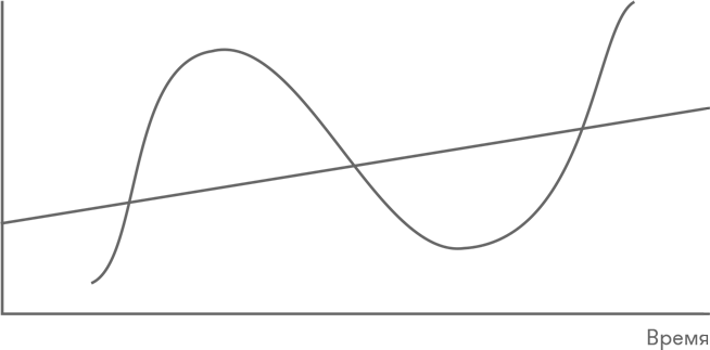 Центральная линия в моих рисунках представляет собой середину, вокруг которой происходит колебание цикла. У нее может быть подразумеваемое направление или долговременный тренд (Webster's New Collegiate Dictionary трактует это слово следующим образом: «долговременный – составляющий или связанный с долгим периодом неопределенной продолжительности»), который обычно имеет восходящую направленность. Так, на протяжении длительных отрезков времени и в конечном счете экономика имеет тенденцию расти, прибыль компаний имеет тенденцию увеличиваться, и (в значительной степени из-за этих двух причин) рынки тоже имеют тенденцию к росту. И если бы эти события относились к числу природных, описываемых научными методами, то экономика, компании и рынки могли бы развиваться по прямой и с постоянным темпом прироста (по крайней мере, некоторое время). Но они не таковы, и поэтому ведут себя иначе.
