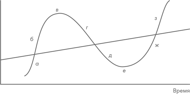 з) и снова продолжающееся движение от среднего уровня до нового максимума.