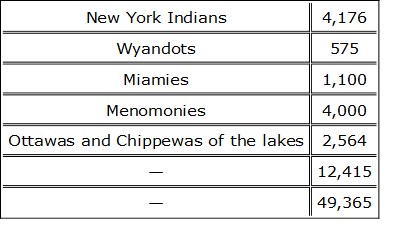 In the succeeding chapter, I shall give the reader a census of the American Indian tribes which still remain. It will be perceived that they are chiefly comprised of tribes which inhabited the Far-West, and were until lately, almost unknown. Of the New England and Virginian confederacies, once so powerful, not a vestige remains; of the Delawares, 826 still exist west of the Mississippi; of the Shawanees, or Shawnees, once so terrible on the banks of the Ohio, 1,272. In fact, all those Indians whose territory bounded the coast first taken possession of by the white men, have been annihilated. I have often heard it argued, when I was in the United States, that the Indians could not be considered as having any claim to the land, as they did not settle or cultivate it, and it is a general opinion that they lived almost entirely by the proceeds of the chase: but this is not a fact; indeed it is disproved by the early settlers themselves, who acknowledge that if they had not been supplied with corn by the Indians they must have starved. That the Indians did not grow more than was sufficient for their own consumption is very probable, but that they did cultivate the land is most certain; indeed, when the country and soil were favourable, they appear to have cultivated to a great extent. When General Wayne destroyed the settlements of the Miamies and Wyandots, on the Miami river, in 1794, he says in his despatch, “never have I beheld such immense fields of corn in any part of America as possessed by these Indians.” The chase was considered by the Indians as a preparatory school for warriors, and was followed accordingly; indeed, a hunting party and a war party were often one and the same thing, as the hunting grounds were common, and when tribes who were at variance fell in with each other, a conflict invariably ensued. My limits will not permit me to enter into the subject more fully; my object has been, in as few pages as possible, to assist the map in giving the reader some idea of the location of the Aborigines of America. If he would know more of this interesting people, there are many very excellent works concerning them written by Americans, which, were they collected together, would form a most valuable and important history.