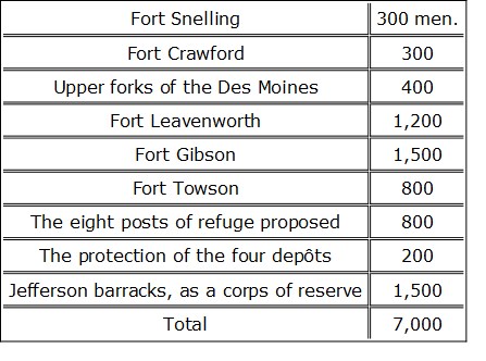 “With the very limited knowledge of that country as yet in possession of this department, it appears to me that six or seven permanent exterior posts would be sufficient to preserve the peace of that frontier. It will be necessary, at the same time, to establish, at convenient points, an interior line of posts, to serve as places of refuge for the inhabitants in periods of danger and alarm, until the militia can march to their succour from the interior, and the troops be put in motion upon the rear of the invaders. Eight of these would be amply sufficient, from which patrols might be kept up along the frontier to enforce the intercourse laws. Both descriptions of forts should be so constructed as to be defended by a small garrison, and in a manner that each part may be successfully maintained against a very superior force, both during the time the whole is being completed, and in the event of any portion of it being burnt or destroyed. This arrangement would require the establishment of a few depôts of arms and supplies, from which communications should be opened to the posts. The accompanying skeleton map presents a view of the relative positions of the posts and depôts, and of the communications from them to the line of defence for the speedy transportation of succours and supplies. A regular force of five thousand men would be sufficient to garrison these posts, and, with a competent reserve at Jefferson barracks, and an effective force at Baton Rouge, would, I think, both ensure the safety of the western frontier, and enable the Government to fulfil all its treaty stipulations, and preserve its faith with the Indians. I would recommend, as an important auxiliary to this system of defence, the organisation of an efficient volunteer force, to be raised in each of the frontier States; the men to be mustered into service for a certain term of time, the officers to be appointed according to their State laws, and to be instructed a certain number of days in each year by the regular officers of the United States army at the posts within the States, and to receive pay during that period. In this manner an efficient corps of officers may be created, and a body of volunteers be at hand to march to the succour of the border settlers and repel the invaders, whenever they are called upon by the proper authority.