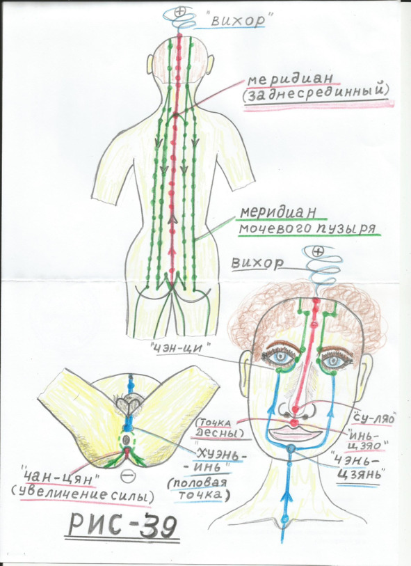 Р И С – 39. Энергетические каналы, связывающие группы точек акупунктуры. На Рис – 39, изображена схема энергетики половой системы человека. Как видно в области промежности изображены шунтирующие каналы главных меридианов половой системы (изображённых пунктирными линиями), в которых и происходит сбой энергетики, по причине «закупорки» этих каналов. Причина известна, слишком частые половые связи, без необходимости зачатия. Во всём животном мире, одной половой связи в год (весной), одной овуляции в год, достаточно для продолжения рода. У земных женщин овуляция происходит по Лунному циклу (ежемесячно), что ускоряет старение организма в 12 раз! Чтобы прочистить эти «пунктирные» каналы, можно использовать энергию Луны. Видимо не случайно, древние цивилизации назвали эту область тела – лоном (лунным). Лунным металлом является серебро! Вероятно, от того, что серебро часто использовали для изготовления зеркал, хорошо отражающих свет. В современной фотографии серебро используется в качестве фиксатора изображения на чёрно-белых фотоплёнках и на фотобумаге. В народной медицине серебро используется для рассасывания закупорок и флегмон и различных воспалений. Для прочистки «пунктирных» каналов лонного сочленения, древние народы, вероятно, применяли разнообразные «пояса верности». Когда супруг уходил на войну, он одевал на свою жену пояс верности из серебра или меди. Бедные дворяне, понятно применяли пояса «верности» из менее благородных металлов (обычно из железа). Понятно, что никакой пользы магнитное железо женщинам не приносило, а только укорачивало им жизнь и приводило к различным недомоганиям. Я проделал нехитрый опыт с железным прутком диаметром 8 мм, согнув его в виде подковы и, получил некое подобие «пояса верности» – замкнув им энергетические каналы промежности. Ночью, в 3 часа я внезапно проснулся от того, что вращение моих нижних «Чакр» застопорилось (остановилось). Ощущение неприятное и очень опасное. Сняв с пояса это металлическое приспособление, я тот час заснул. Вполне понятно, что князья и состоятельные дворяне, которые применяли пояса верности для своих жён из серебра, или меди, не могли не заметить, что их жёны после данной экзекуции хорошели. Но, только достаточно умные люди смогли, догадаться об истинной причине, оздоровления женщины (обычно, расцвет красоты воспринимался ревниво), как измена мужу. Понятно, что эту тайну (кто догадался) князья, старались сохранить и передавать своим потомкам. Тайна «пояса верности» была сохранена надёжно. Вполне понятно, что простые люди снабжали своих жён «поясами верности» изготовленных из магнитного железа (тогда женщины чахли), что воспринималось как тоска по мужу. Долго ли эта экзекуция продолжалась, пока кто-то не догадался, что магнитное железо являлось для женщин истинным источником страданий. То, что это было именно так, известно из древнего Рима. Римляне прекрасно знали, что ножные и ручные кандалы, настолько сильно снижают энергетику человека, что раб, закованный в кандалы, был не в состоянии совершить побег или оказать сопротивление. Серебряные «пояса верности», скорее всего, изготавливались крайне редко (из-за чернения металла), а вот медные и золотые нашли широкое применение в средние века и вероятно в глубокой древности, когда люди научились плавить металл. Серебро, мет