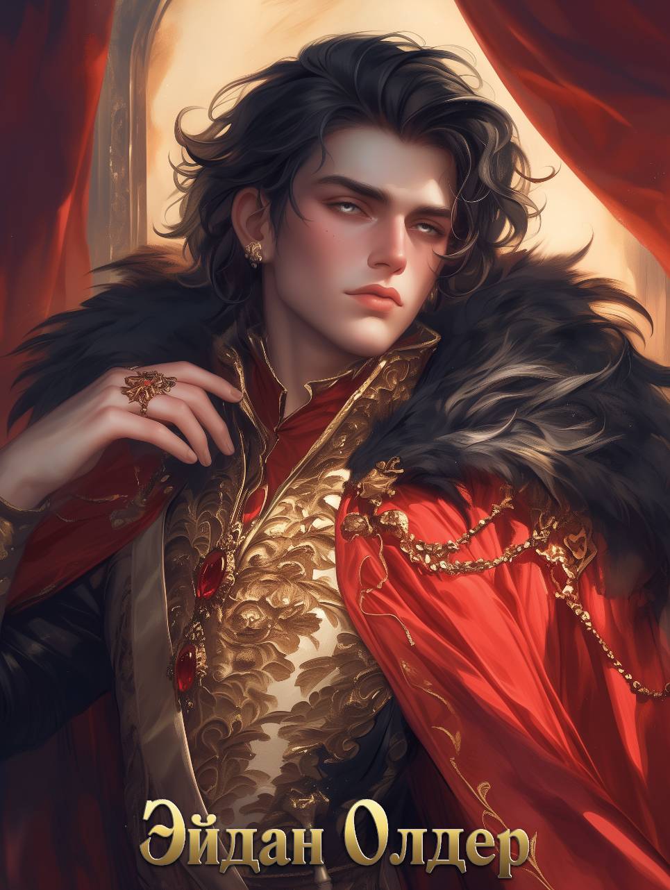 Эйдан был одет в чёрный парадно-выходной костюм с золотыми вышивками и камнями граната на мундире. Алая мантия с воротником из меха чёрного горного медведя была украшена орнаментами и золотыми цепочками.