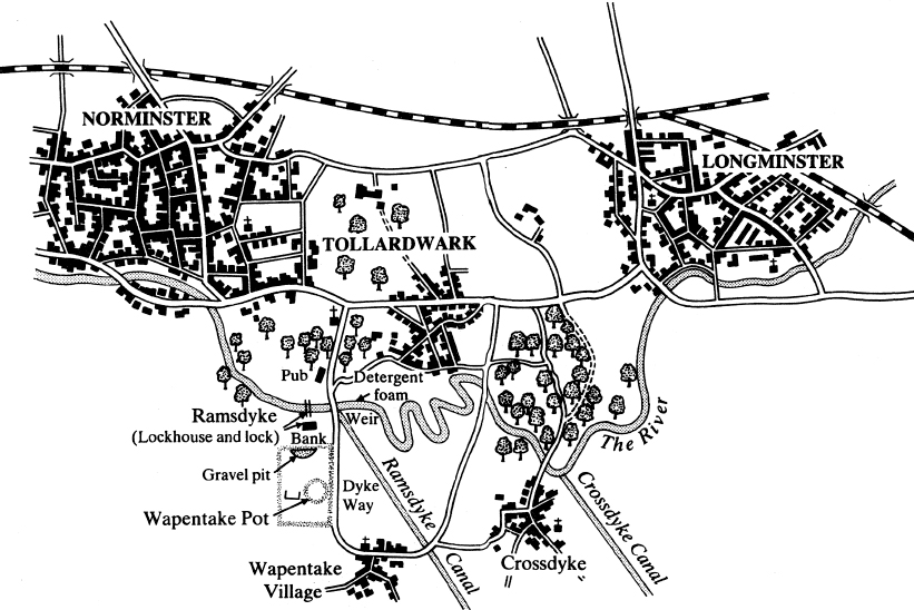Placed about the window were photographs of M.V. Zodiac in transit and of the places she visited. In the background hung a map of the river and the canals that articulated with it: Ramsdyke. Bullsdyke. Crossdyke. A five day cruise from Norminster to Longminster and back was offered. Passengers slept and ate on board. The countryside, said a pamphlet that lay on the floor, was rich in historical associations. Someone with a taste for fanciful phrases had added: ‘For Five Days you Step out of Time.’