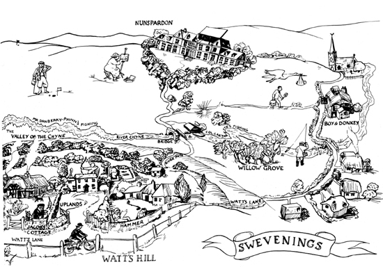 ‘Really,’ Nurse Kettle thought with satisfaction, ‘it is as pretty as a picture.’ And she remembered all the pretty pictures Lady Lacklander had made in irresolute watercolour, some from this very spot. She was reminded, too, of those illustrated maps that one finds in the Underground, with houses, trees and occupational figures amusingly dotted about them. Seen from above, like this, Swevenings resembled such a map. Nurse Kettle looked down at the orderly pattern of field, hedge, stream, and land, and fancifully imposed upon it the curling labels and carefully naïve figures that are proper to picture-maps.