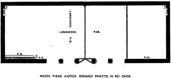 На третьем плане (рис. 5) изображен тесный корт для игры рукой, но удобен также для палеты или паллеции (palletia), на конце capo находился брус из досок высотой 3 фута и на расстоянии 3 футов от двери в боковой стене, через которую входили на корт; длиной 8 футов параллельно плоскости корта; в конце к нему была прикреплена другая доска с наклоном 1½ фута, встречающаяся со стеной справа. Она располагалась на высоте 8 футов от пола; а на ее стыке появилось покрытие, служившее tavolato (или пентхаусом), простиравшееся до стены и вдоль всей стены capo del giuoco, чтобы мяч мог скатиться с нее. Это создавало ограждение вокруг двери и имитацию тамбура, а также галерею, которая могла вместить многих зрителей. Та часть парапета, которая соединялась со стеной, могла открываться и закрываться, давая доступ к игровой площадке.