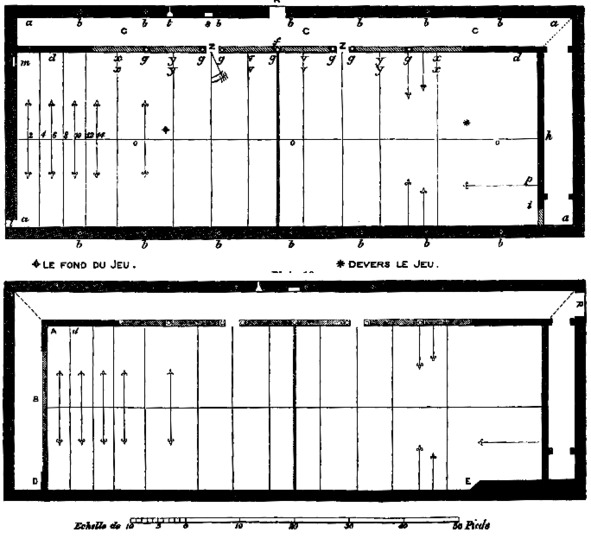 В фронтоне на другом конце корта, напротив квадратного отверстия, описанного выше, на уровне пола есть еще одно квадратное отверстие, l, шириной по 16 дюймов с каждой стороны, сделанное в толще стены самого фронтона. В том месте, где заканчивается галерея, прикреплена доска (l’ais), m, шириной 1 и высотой 6 футов, за которой делается углубление, эффект которого состоит в том, что доска, не касаясь стены (кроме ее краев), при попадании в нее мячом издает другой звук118, чем тот, который дает стена.
