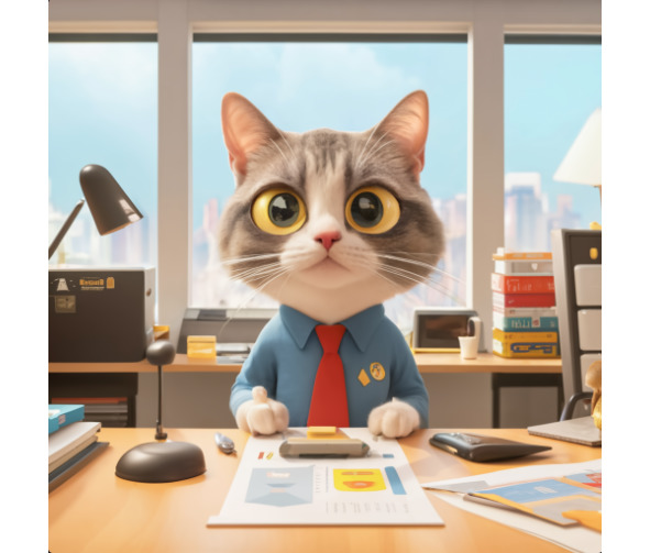 In a bustling business district, there stood a towering skyscraper where Kevin the cat worked. Kevin wasn’t your ordinary feline – he was a dedicated office worker with a keen sense of responsibility. Every day, he would don his tiny jacket and head to work as a low-level manager in the heart of the city.