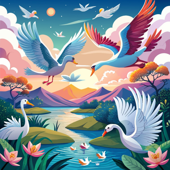 И затем, словно по волшебству, он наткнулся на зрелище захватывающей дух красоты – мерцающее озеро, в его кристально чистых водах отражаются яркие оттенки заходящего солнца. По его спокойной поверхности грациозно скользила пара величественных лебедей, их белоснежные перья трепал легкий ветерок, когда они ныряли и танцевали на воде.