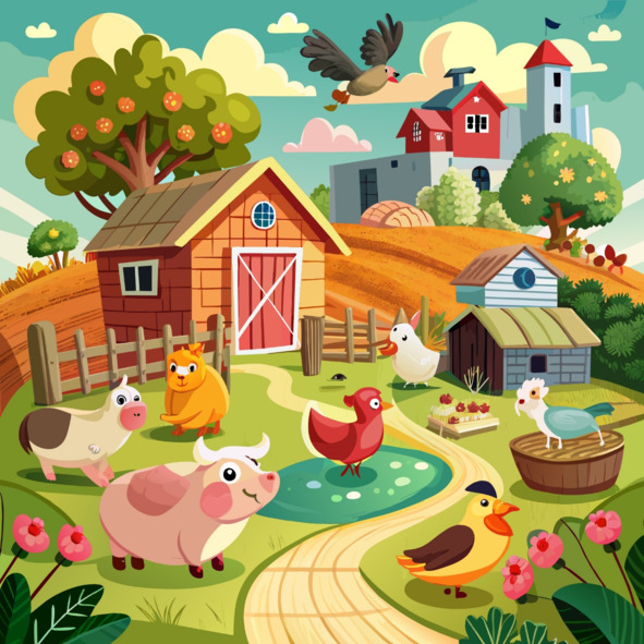 Цыплята клевали и царапали плодородную почву, откладывая яйца в уютные гнезда, в то время как свиньи резвились в грязи, их кудрявые хвосты радостно виляли. Вместе они неустанно трудились, чтобы ферма фермера Билла процветала.