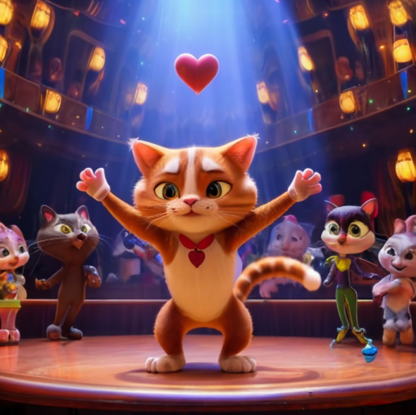 One starry night, when the moon was casting its silvery light on the cobbled streets, Antonio had a dream. In his dream, he found himself on a large stage, bathed in the light of spotlights that illuminated his fur with a shimmering glow. Confidently waving his tail, he began to sing – not in words, but in a melody so pure and fascinatingly beautiful that it touched the hearts of all who listened.