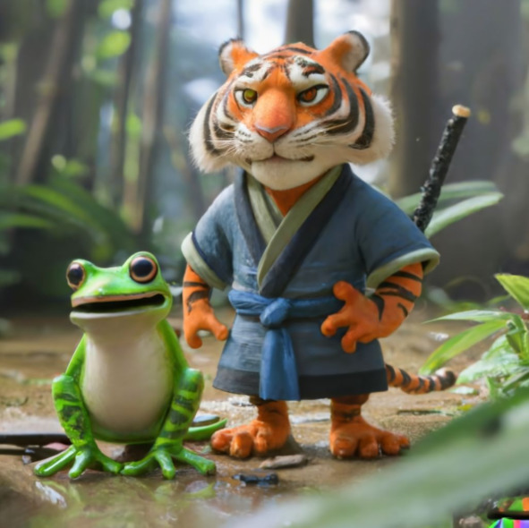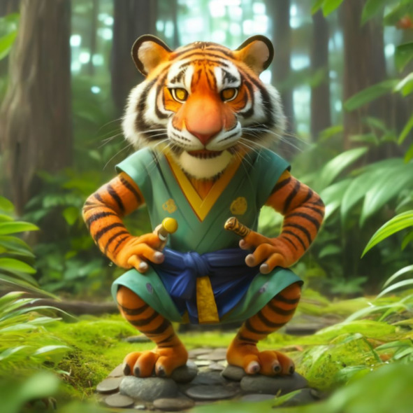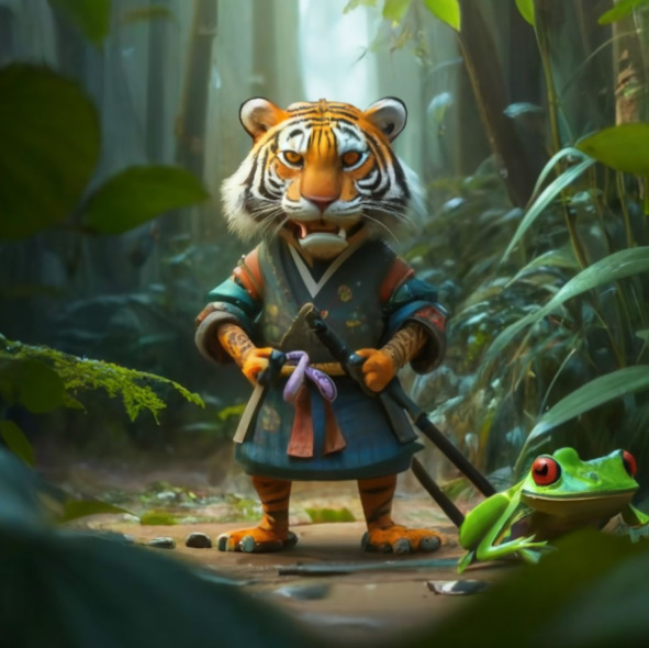 Next to Cayson’s home, a group of noble samurai warriors resided. Among them was Eden, a powerful and fearless tiger. Eden and Kayson quickly became friends, bonding over their shared love for adventure and bravery.