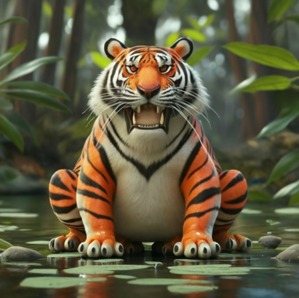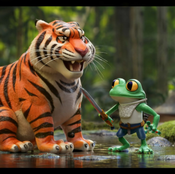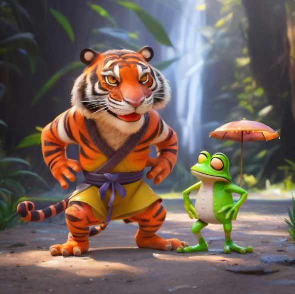 Eden was a magnificent sight to behold, with sleek orange fur and piercing amber eyes that gleamed with determination. His presence was commanding, yet his heart was gentle and kind. Despite his formidable appearance, he had a soft spot for the curious little frog who hopped around with boundless energy.
