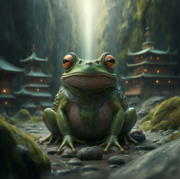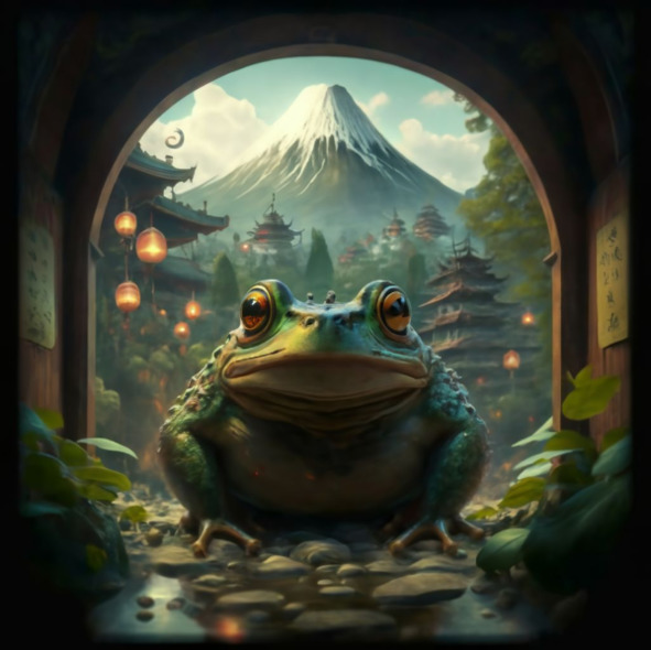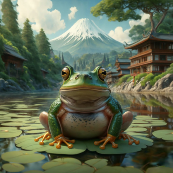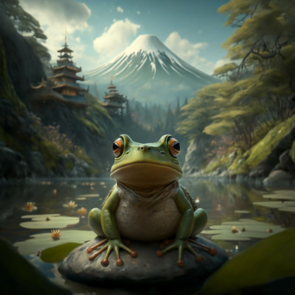 In the mountains near a Japanese monastery, there lived a young and adventurous frog named Kayson. She hopped around happily, exploring the lush greenery and clear streams that surrounded her.