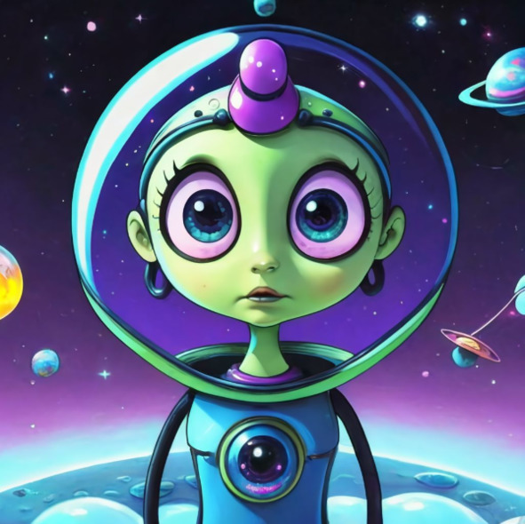 In a galaxy far, far away, there lived a young alien girl named Mara. Mara was unlike any other creature in the universe. With shimmering purple skin and sparkling green eyes, she lived aboard a magnificent spaceship that soared through the vast expanse of space.
