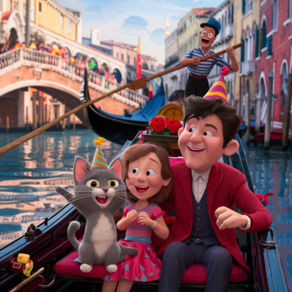With these words, the Chiellini family headed for the shimmering waters of the canal, where a gondola was waiting for them. The gondolier, a cheerful man with a melodious voice like a songbird, greeted them with a warm smile.
