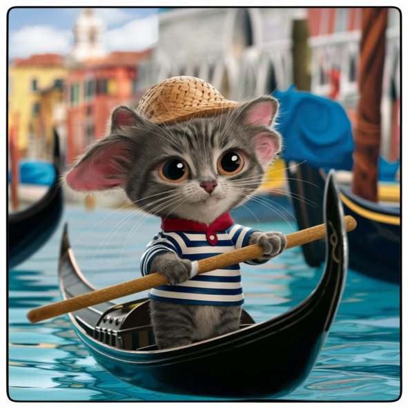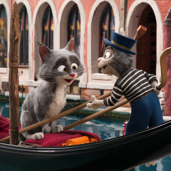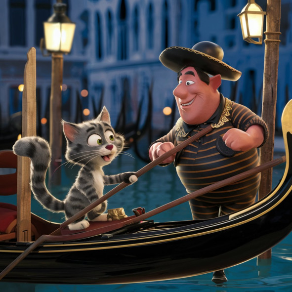 The gondola glided gracefully through the serene waters of Venice, and Osman the cat took the opportunity to strike up a conversation with Tonny the gondolier. With a curious tilt of his head and a slight flick of his tail, Osman approached Tonny, his golden eyes lit up with interest.